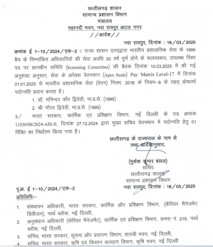 रायपुर: छत्तीसगढ़ के वरिष्ठ आईएएस अधिकारी गौरव द्विवेदी और उनकी पत्नी मनिंदर कौर द्विवेदी को प्रोफार्मा प्रमोशन दिया गया है। यह प्रमोशन उन्हें प्रमुख सचिव से अपर मुख्य सचिव के पद पर दिया गया है। सामान्य प्रशासन विभाग ने इस संबंध में आधिकारिक आदेश जारी कर दिया है। गौरव द्विवेदी वर्तमान में केंद्र सरकार के अधीन प्रसार भारती के मुख्य कार्यकारी अधिकारी (सीईओ) के पद पर कार्यरत हैं। वहीं मनिंदर कौर द्विवेदी केंद्रीय कृषि विभाग के एक उपक्रम में प्रबंध निदेशक (एमडी) हैं। प्रोफार्मा प्रमोशन का नियम उन अधिकारियों पर लागू होता है जो केंद्रीय प्रतिनियुक्ति पर काम कर रहे हैं।