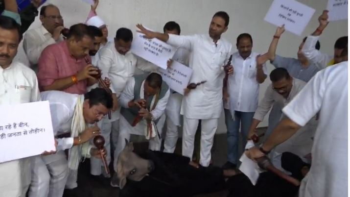 भोपाल। मध्य प्रदेश विधानसभा के मानसून सत्र का दूसरा दिन कांग्रेस के प्रदर्शन के साथ शुरू हुआ। कांग्रेस विधायक प्रतीकात्मक रूप से भैंस बने और उनके सामने अन्य विधायकों ने बीन बजाकर विधानसभा परिसर में प्रदर्शन किया। प्रदर्शन पर कांग्रेस विधायकों ने कहा कि मध्य प्रदेश सरकार भैंस की तरह सोई हुई है। अन्य पिछड़ा वर्ग को 27 फीसदी आरक्षण नहीं मिल पा रहा है। युवाओं को नौकरी नहीं मिल रही है, हम सवाल लगाते हैं, तो सरकार जवाब नहीं देती है. ऐसे में हम उसे बीन बजाकर जगा रहे हैं।