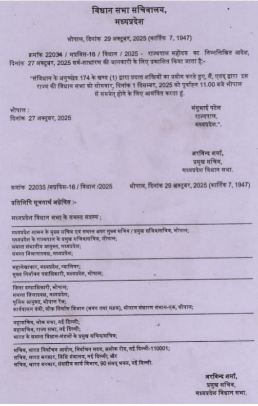 मध्य प्रदेश विधानसभा का शीतकालीन सत्र 1 दिसंबर से, कई अहम विधेयक होंगे पेश