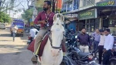 देवास में बैंक कर्मचारी का अनोखा अंदाज, घोड़े पर सवार होकर पहुंचा ऑफिस
